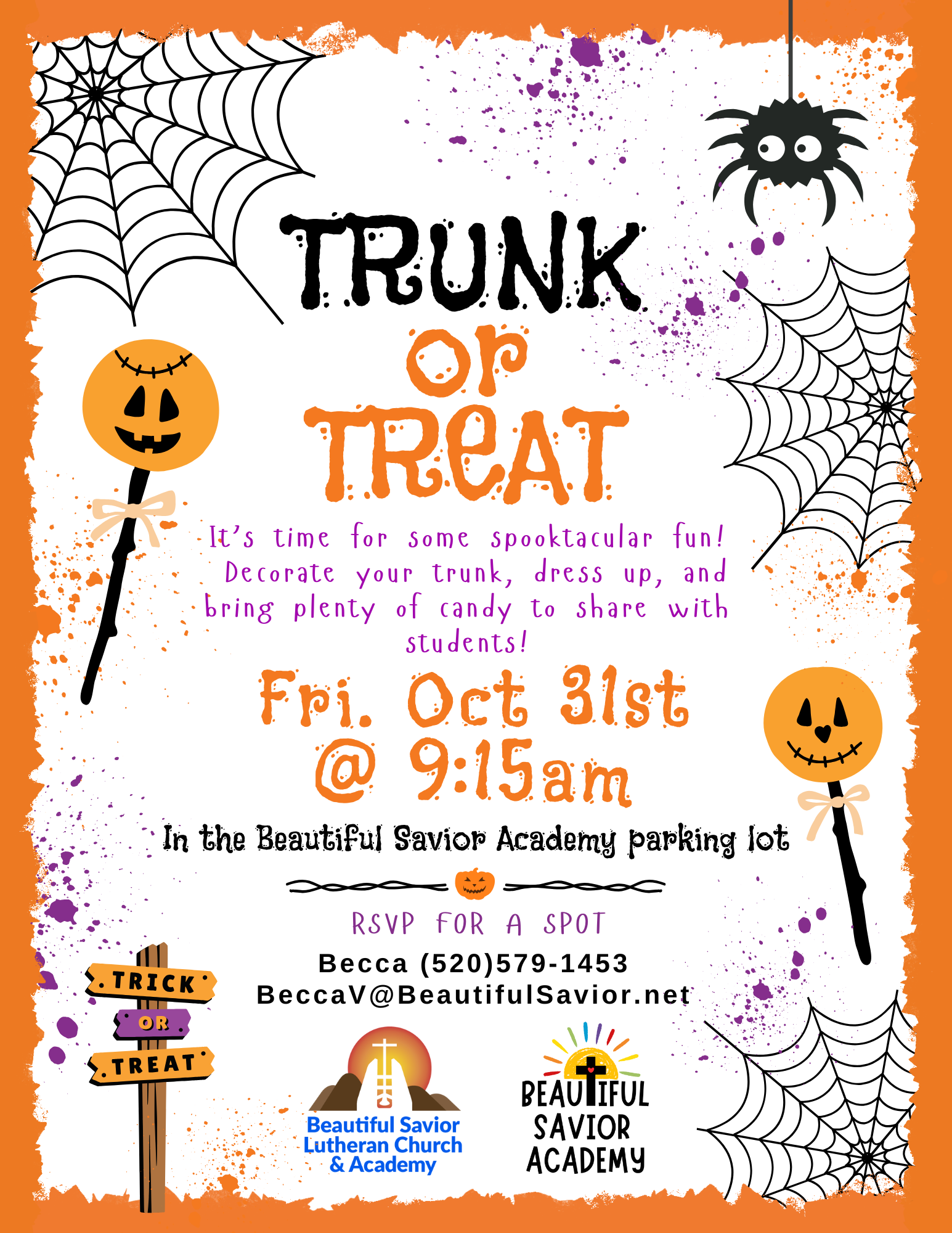 Come out and participate in our Academy's Trunk Or Treat for the kids! Decorate your trunk or truck bed, Dress up if you wish, and hand out your candy and prizes to all our little goblins. If you are interested in participating, please contact the church office office@beautifulsavior.net or Becca Vorholzer, Academy Director BeccaV@beautifulsavior.net