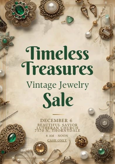 Just in time for Holiday shopping, come out and shop at our Vintage Jewelry Sale on Saturday, Dec. 6 from 8am-Noon in Werner Hall. A wide variety of boxed vintage jewelry including rings, earrings, necklaces, matching sets, bracelets. Also, a few watches, charms and Christmas jewelry. The items are new and in original jewelry boxes. All the proceeds go to charities designated by our Women’s Bible group, Joy Circle.